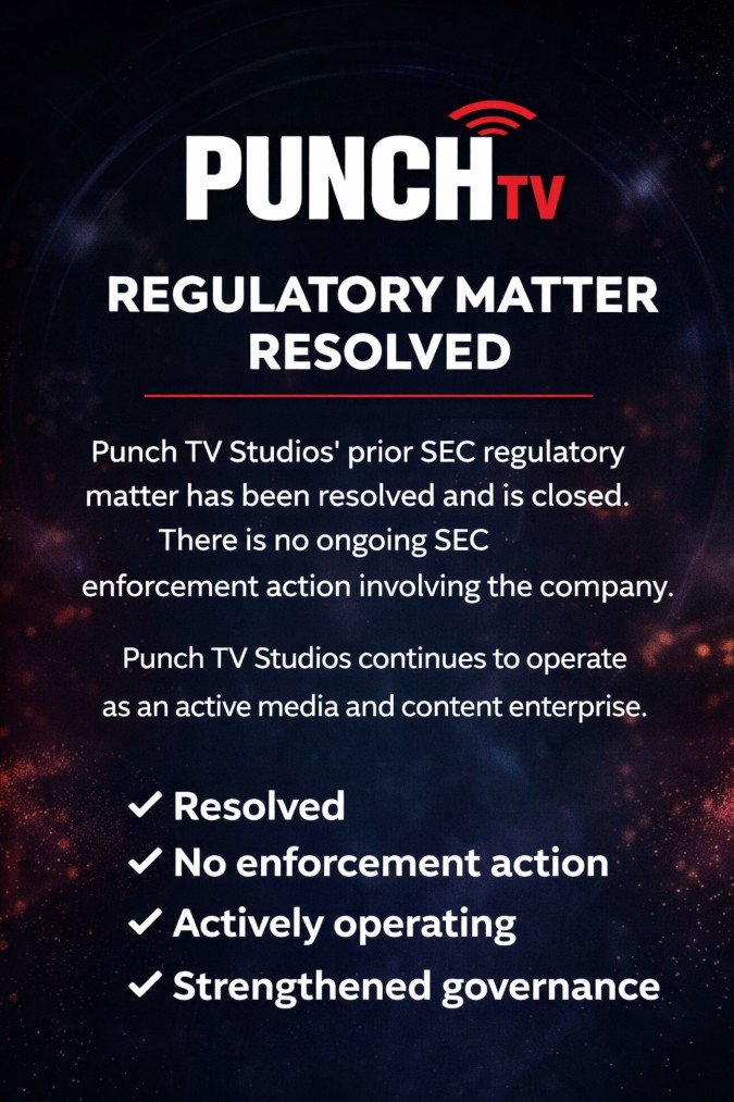 Punch TV Studios, Inc. confirms that its prior regulatory matter has been resolved. The company is not currently subject to any ongoing SEC enforcement action and continues to operate as an active media enterprise.